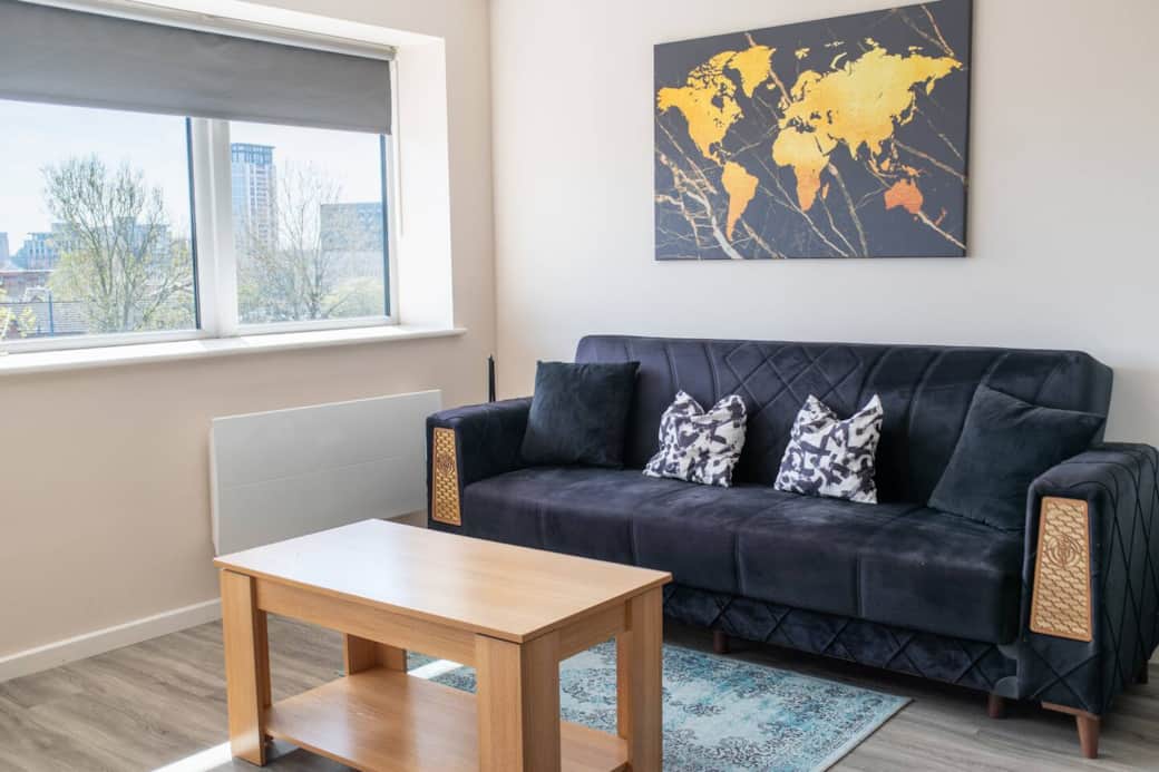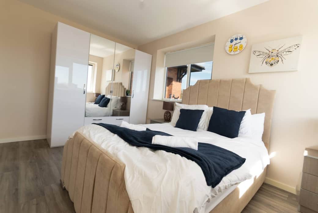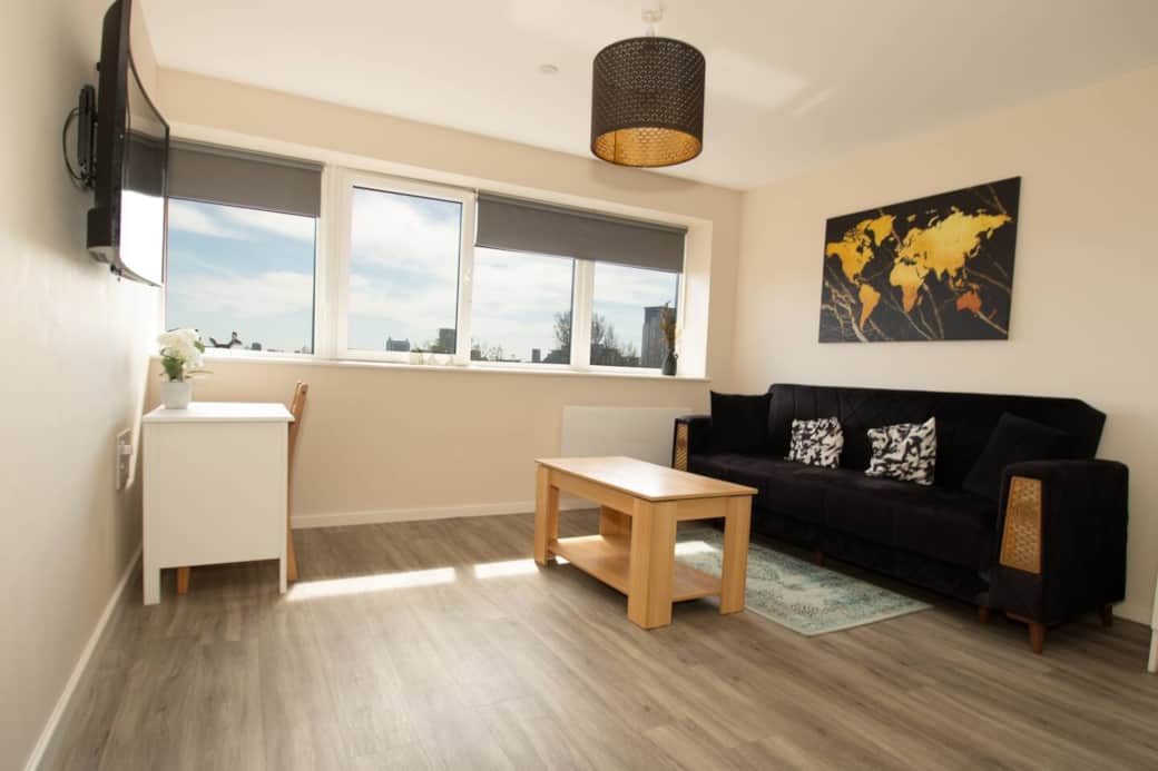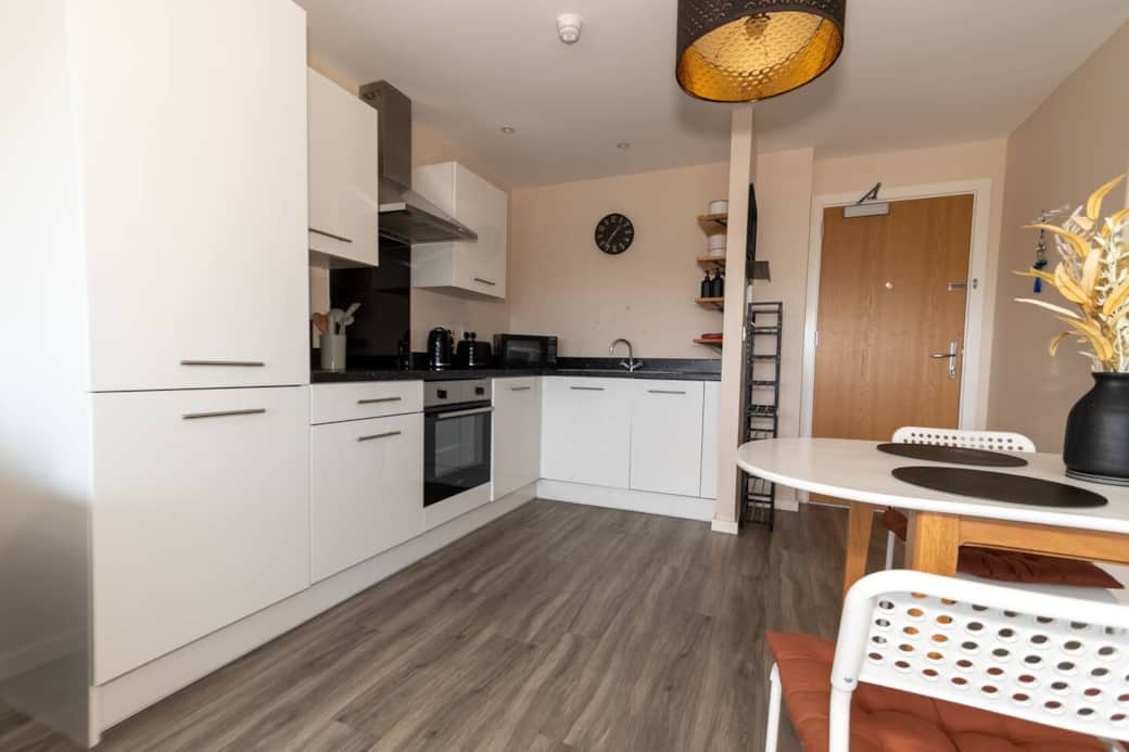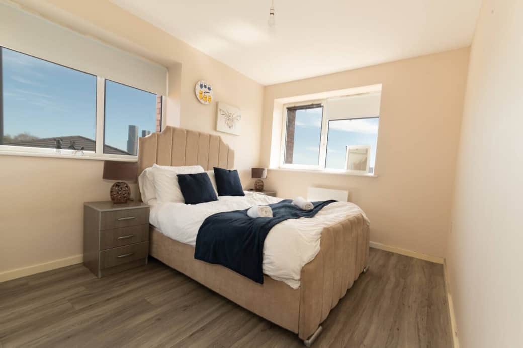 Top-floor corner apartment with panoramic Manchester city skyline and MediaCity views. Fully furnished, secure parking, and superfast Wi-Fi included. Perfect for contractors, business travellers and couples. Steps from the BBC, MediaCity and a short commute to Manchester City Centre.